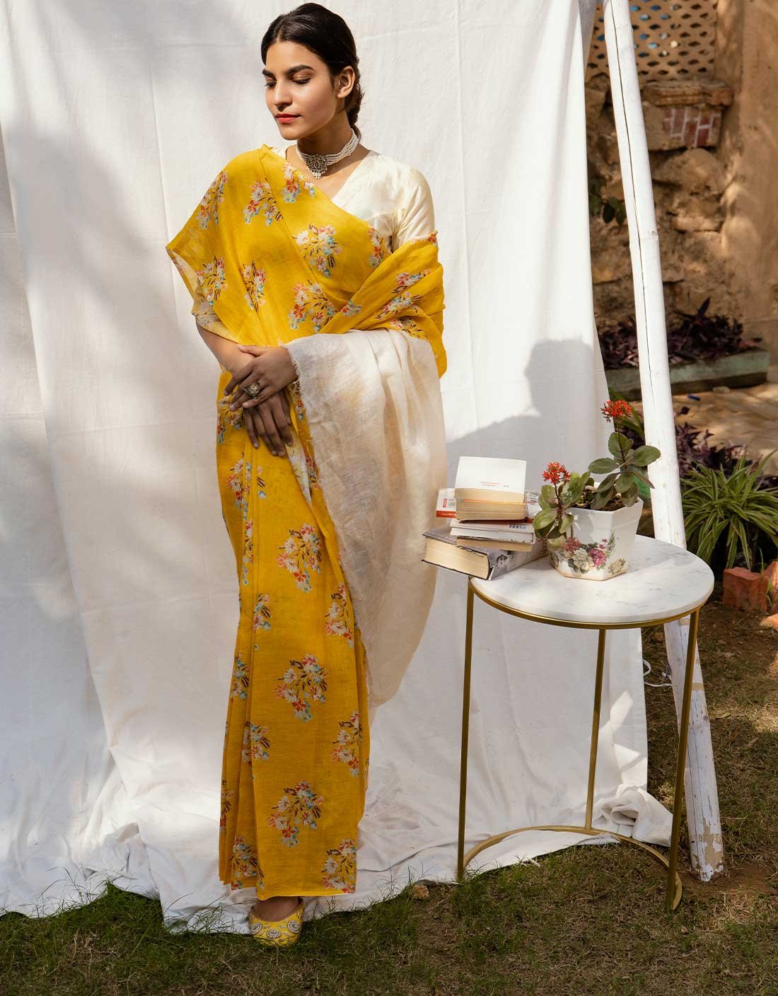 This Golden Meadow Yellow Pure Linen Saree is a vibrant blend of artistry and tradition. Handprinted and handwoven by skilled artisans, it features delicate floral motifs on a soft, breathable linen base. Its lightweight drape and lively yellow hue make it perfect for festive occasions, daytime events, or adding a touch of effortless elegance to your everyday style.