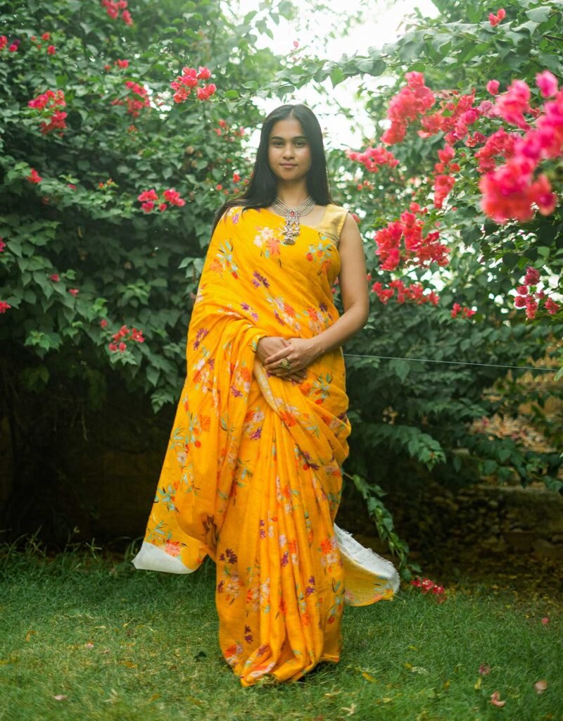 Bright, joyful, and full of charm — the Mango Delight Pure Linen Saree features vibrant handprinted floral motifs on a rich mango-yellow base. Expertly handwoven and handprinted by skilled artisans, this saree drapes effortlessly with a soft, breathable feel ideal for festive occasions, daytime celebrations, or adding a burst of sunshine to everyday elegance. Its lively color and artisanal details make it a standout piece for lovers of bold yet graceful Indian wear.