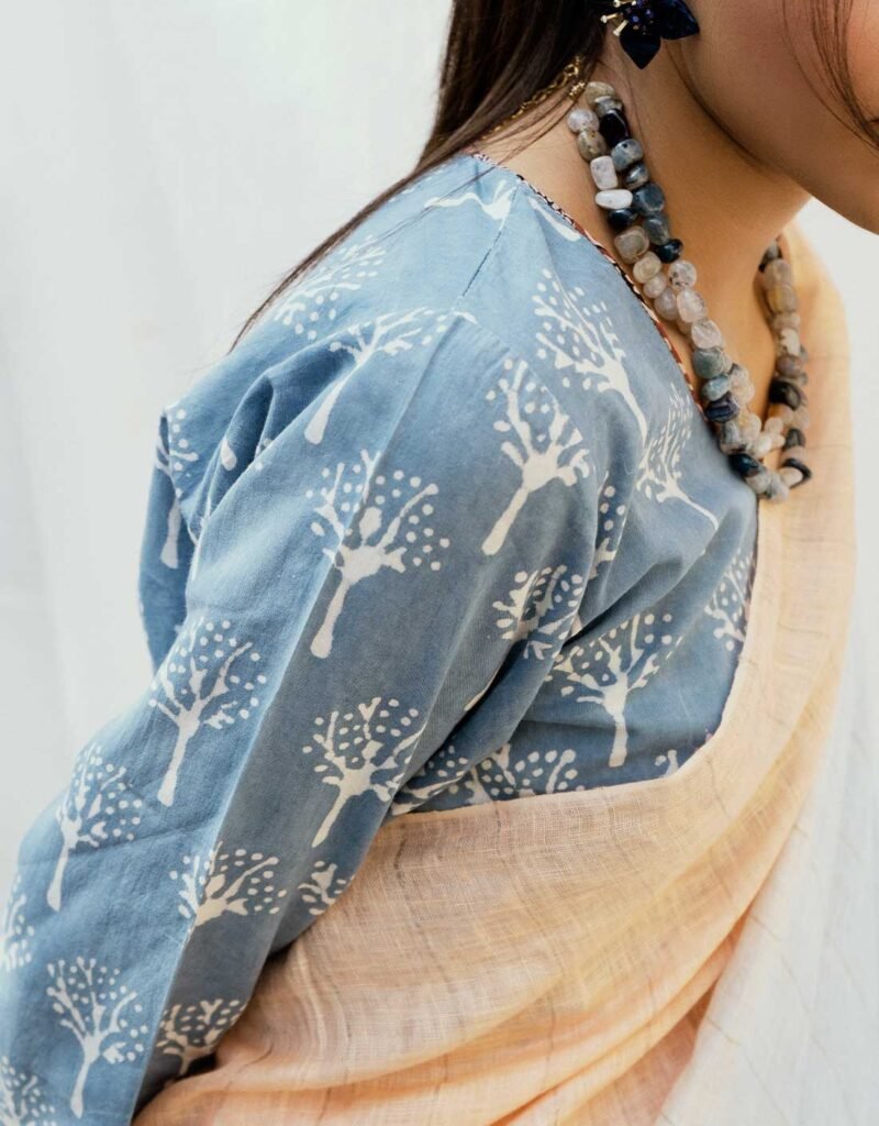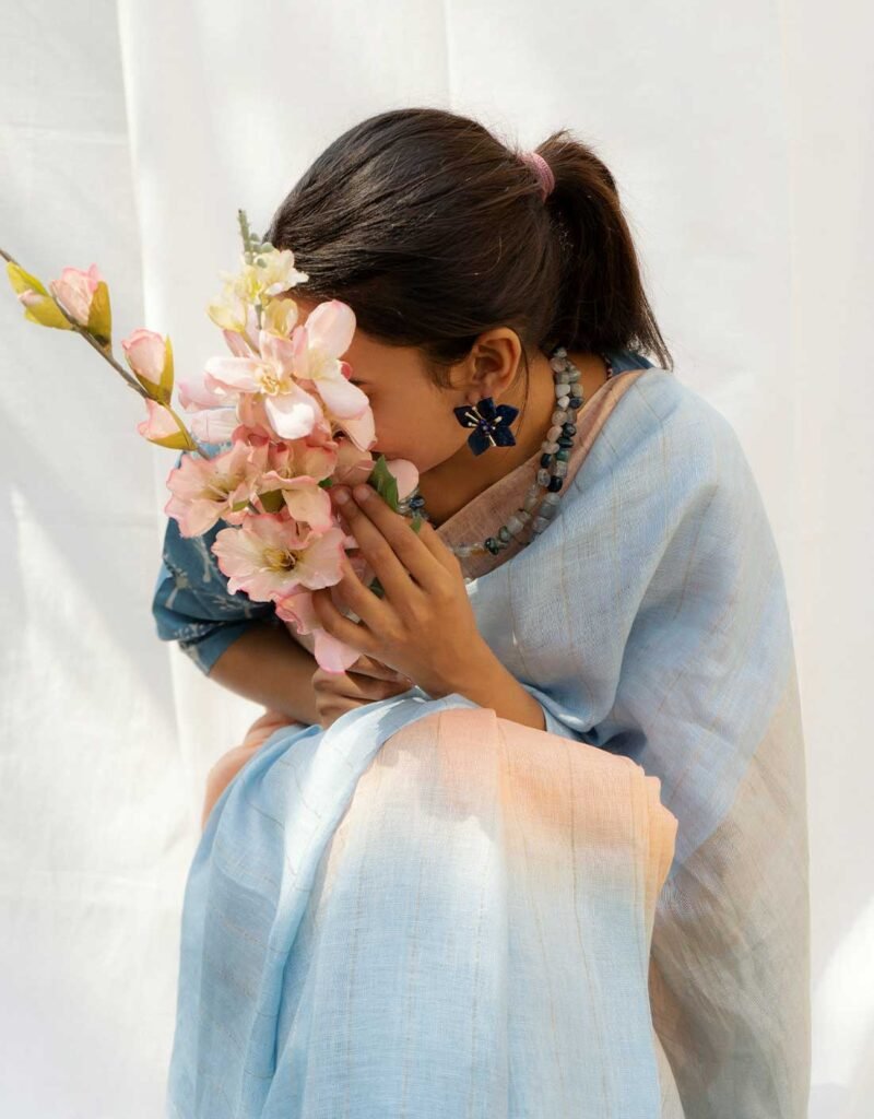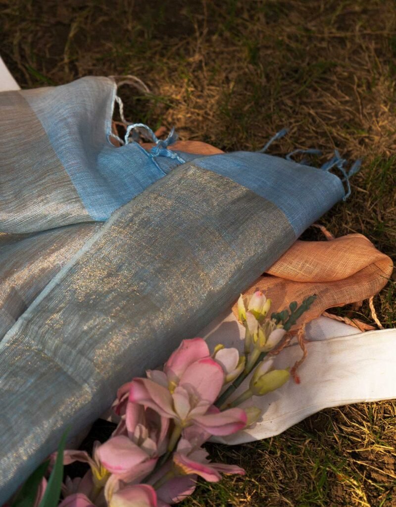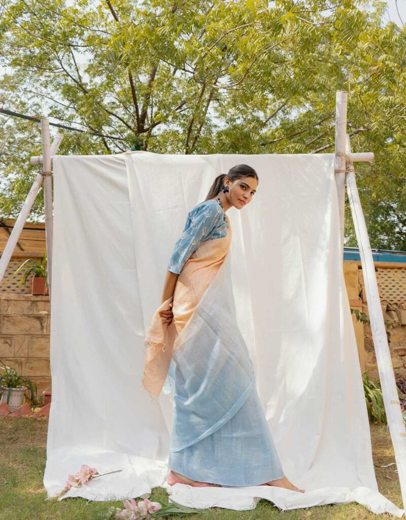 Be the first to review “Ombre Peach & Sky Blue Pure Linen Saree”